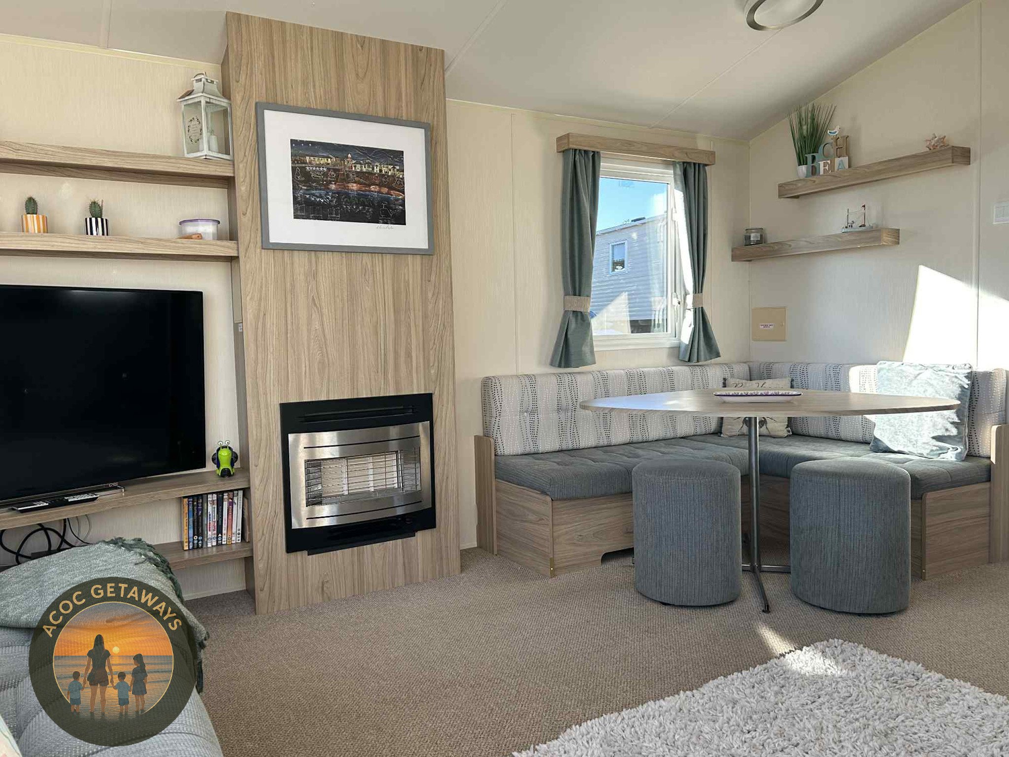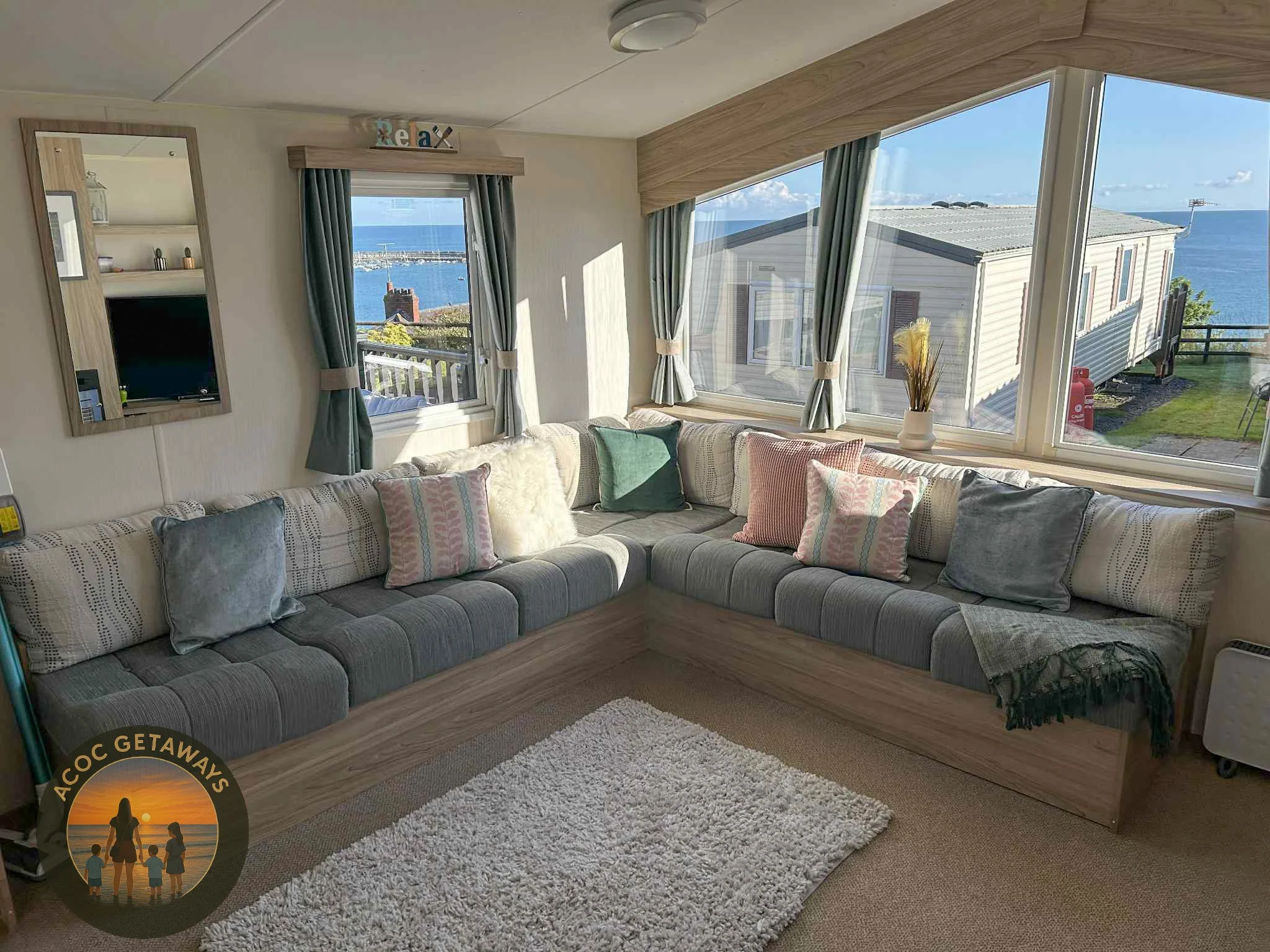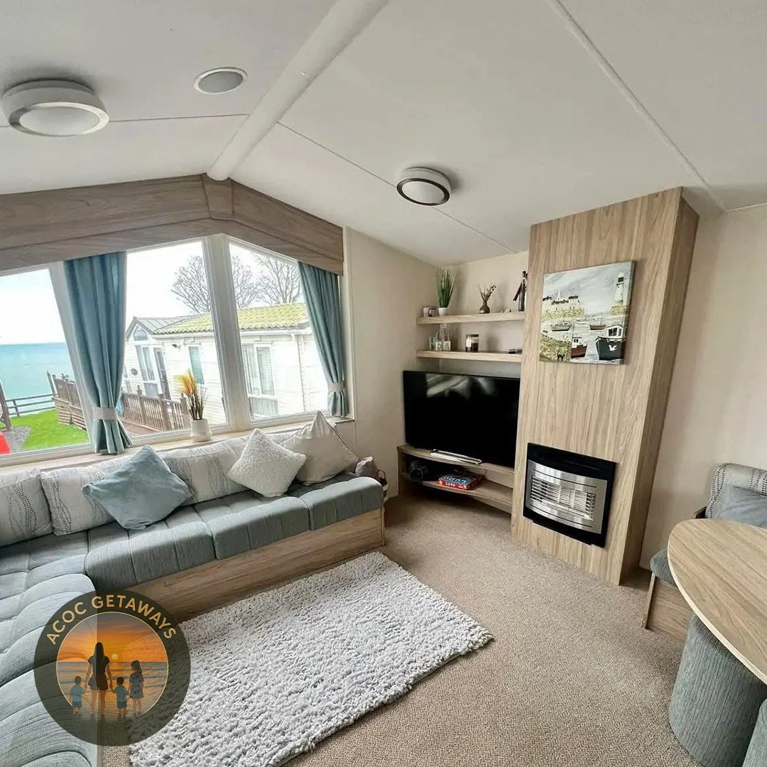 Bright & Airy Living Area – large front windows flood the space with natural light and offer a glimpse of the sea. Relax on the spacious sofa seating, enjoy the wall-mounted TV, and feel at home with the modern electric fire.